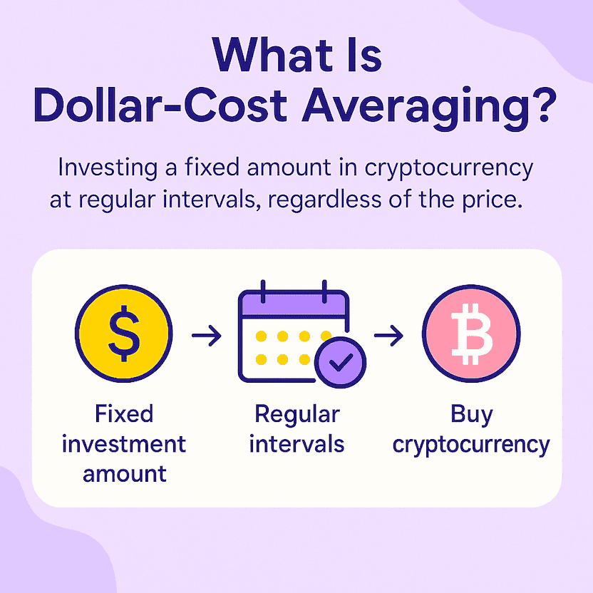 Dollar-cost averaging means investing a fixed amount of money into cryptocurrency at regular intervals, regardless of the current price. Instead of trying to time when Bitcoin is "cheap," you buy the same dollar amount every week, month, or pay period.